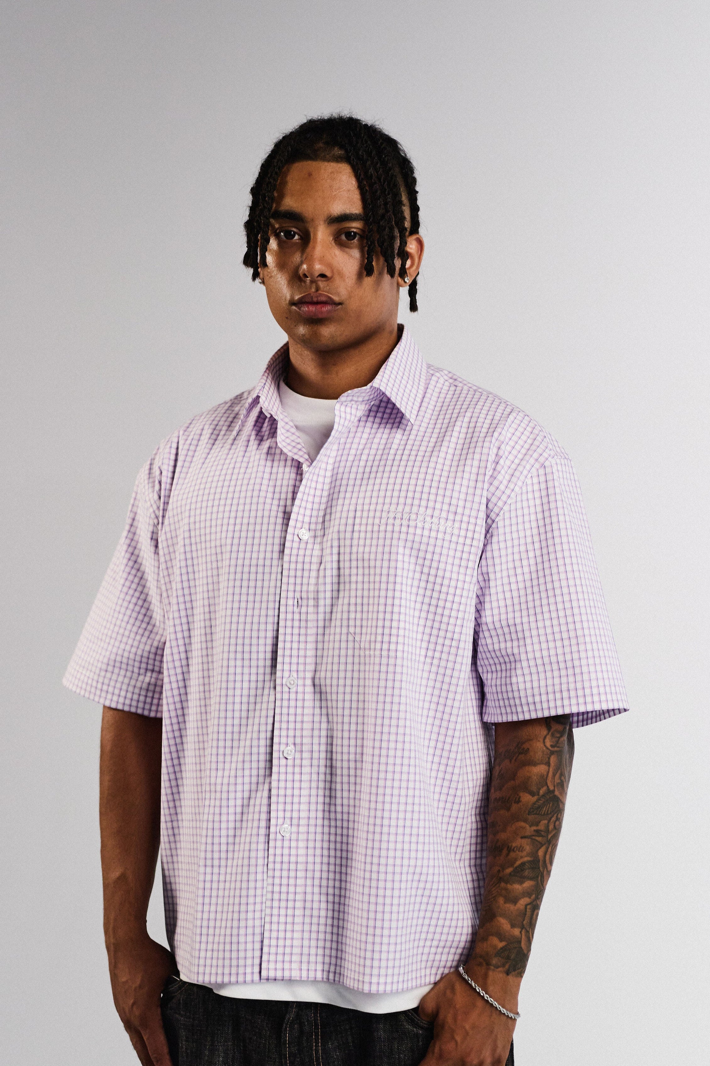 .Keep it clean but still street with this oversized lilac/white check shirt from JBJclothing. The loose fit, short sleeves and button-up front make it perfect for layering over a tee or rocking solo. Subtle check details and light pastel tones give it that fresh vibe, while the relaxed cut keeps it street-ready.
